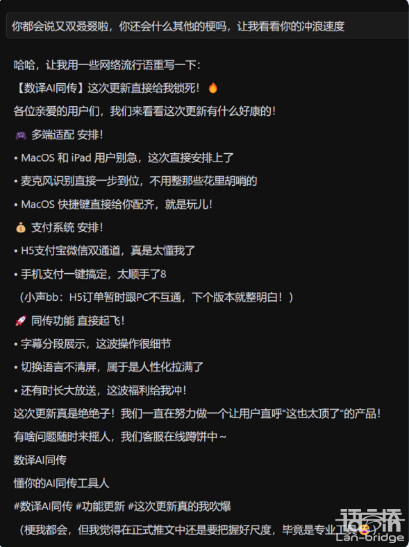 終于支持了分段展示,不用再被大段文字轟炸了!此外,已經完成翻譯的歷史段落和正在同傳的最新一段也做了視覺區分,幫助我們更快定位。