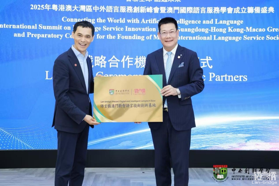 會議期間,語言橋集團與中西創(chuàng)新學院正式簽署戰(zhàn)略合作協(xié)議,標志著雙方在數(shù)智語言服務領域正式開啟了深度合作的新篇章。同時,憑借在語言技術與創(chuàng)新應用方面的領先實力,并獲授“語言橋澳門數(shù)智語言技術創(chuàng)新基地”牌匾,標志著雙方在數(shù)智語言服務領域開啟深度合作新篇章。